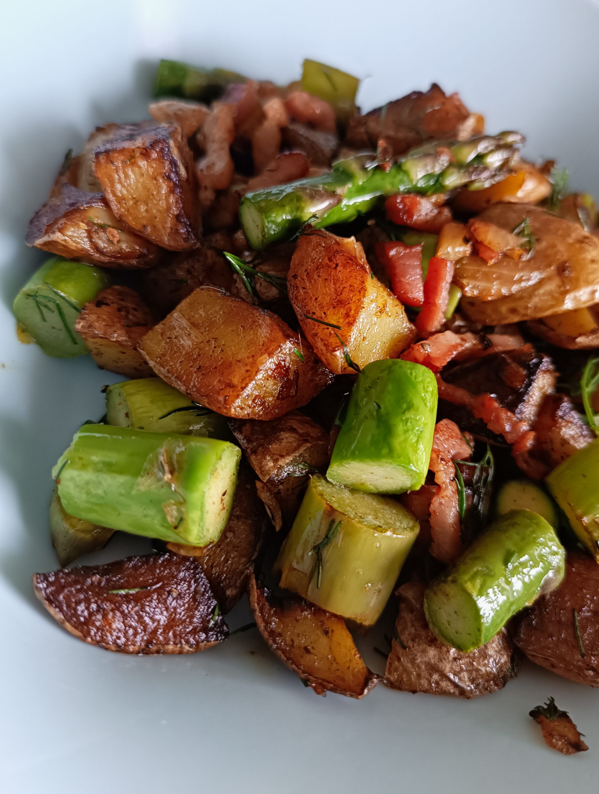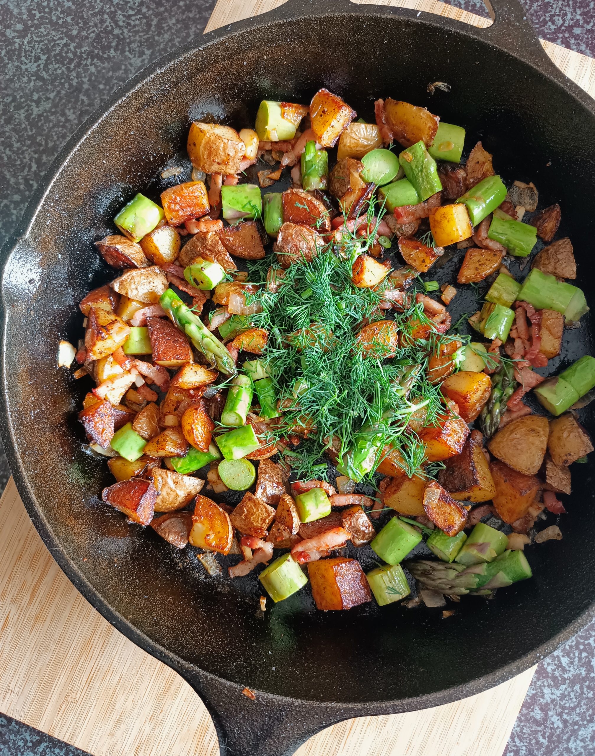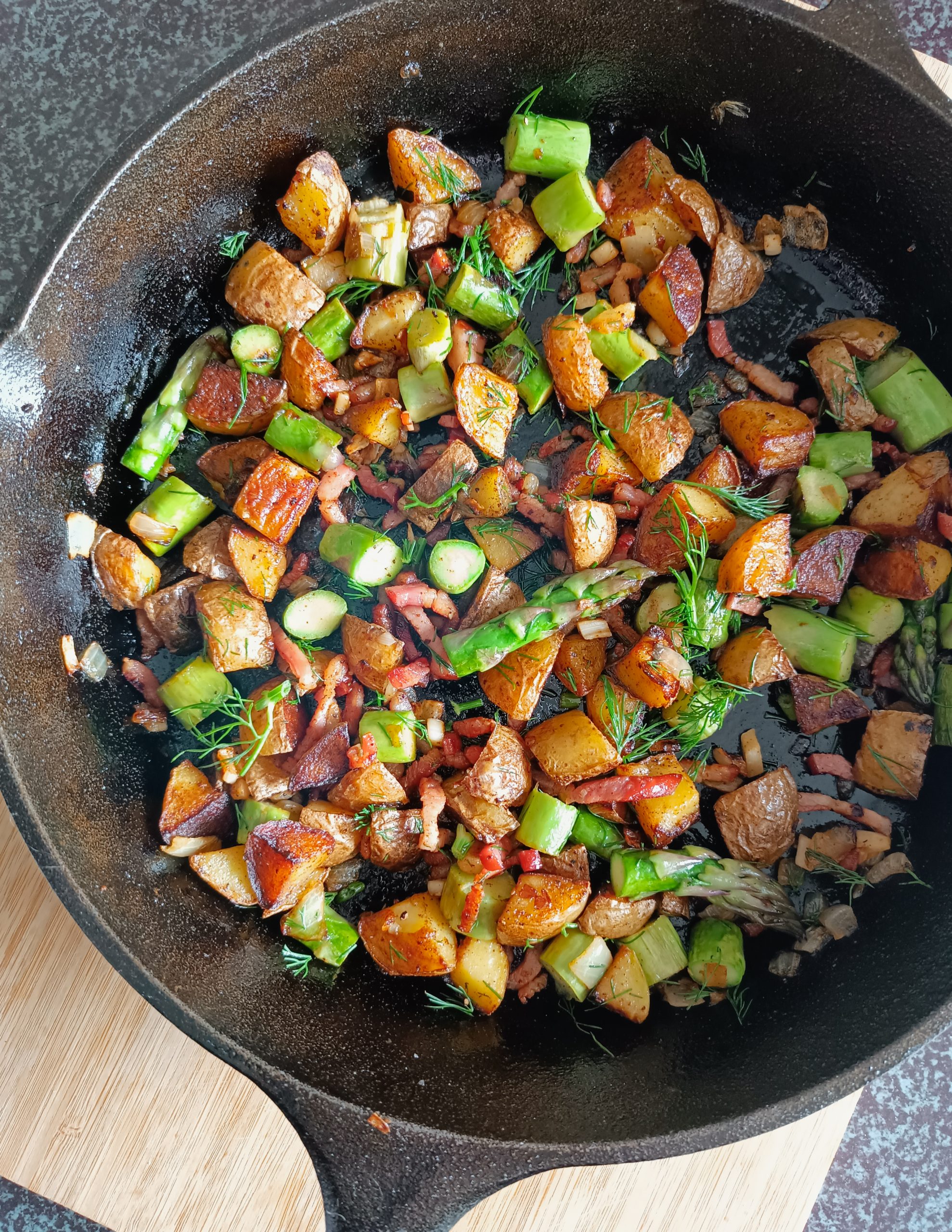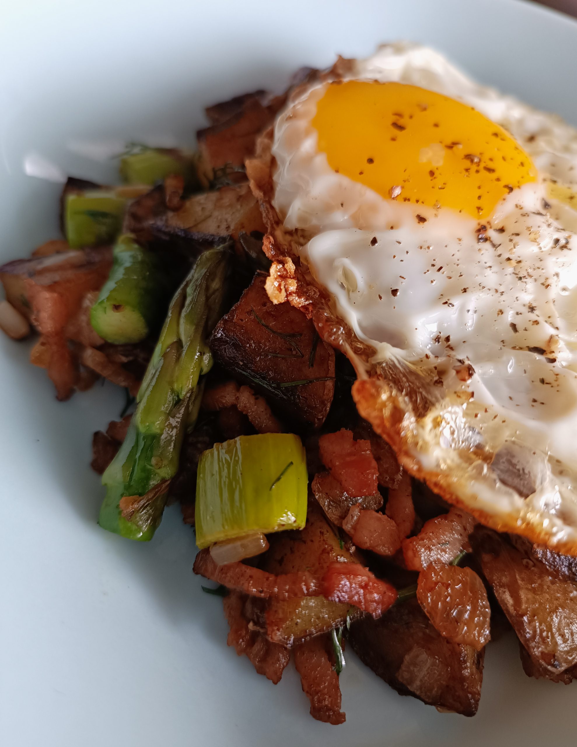 Cette fois, on la joue asperges vertes à peine sautées, parmi des bouts de patates dorées, un gros tas d’oignons entêtants et un nuage de lardons (si l’envie t’en prend).