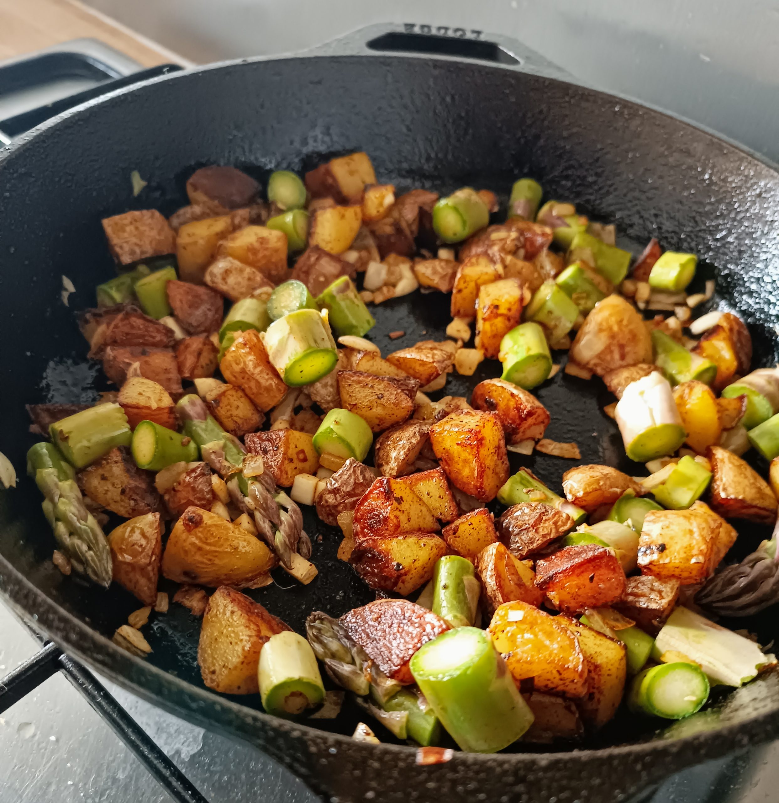 3. Quand c’est presque bon, ajoute l’oignon et laisse-le cuire 5 minutes avec les pommes de terre, en diminuant légèrement le feu. On ne les ajoute pas plus tôt, sinon ça brûle. Ajoute ensuite l’ail, le paprika, le piment et les asperges, mélange bien. Recouvre d’un couvercle et laisse cuire encore 5 minutes, le temps de faire frire un oeuf dans une autre poêle. Les asperges vont rapidement cuire à la vapeur sous le couvercle (si elles sont épaisses, ça peut prendre plus de temps).