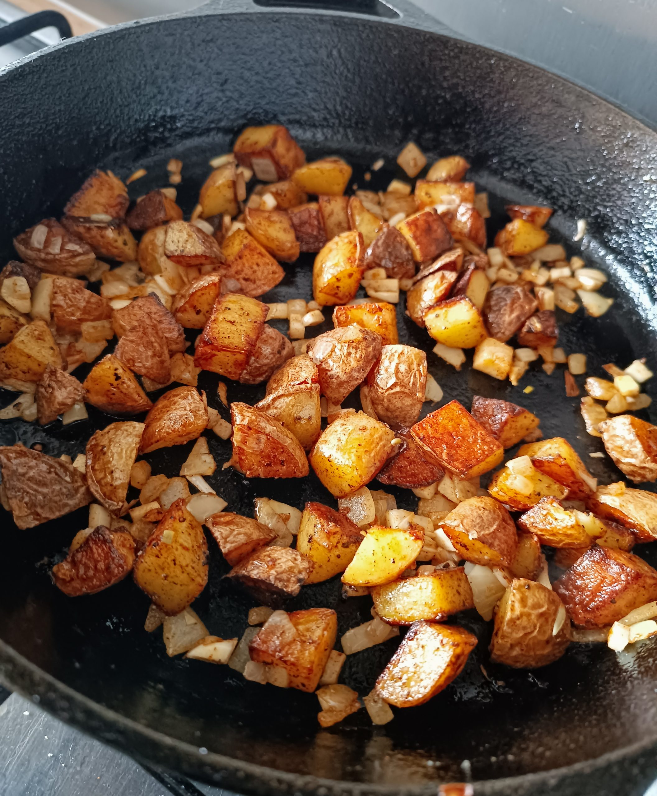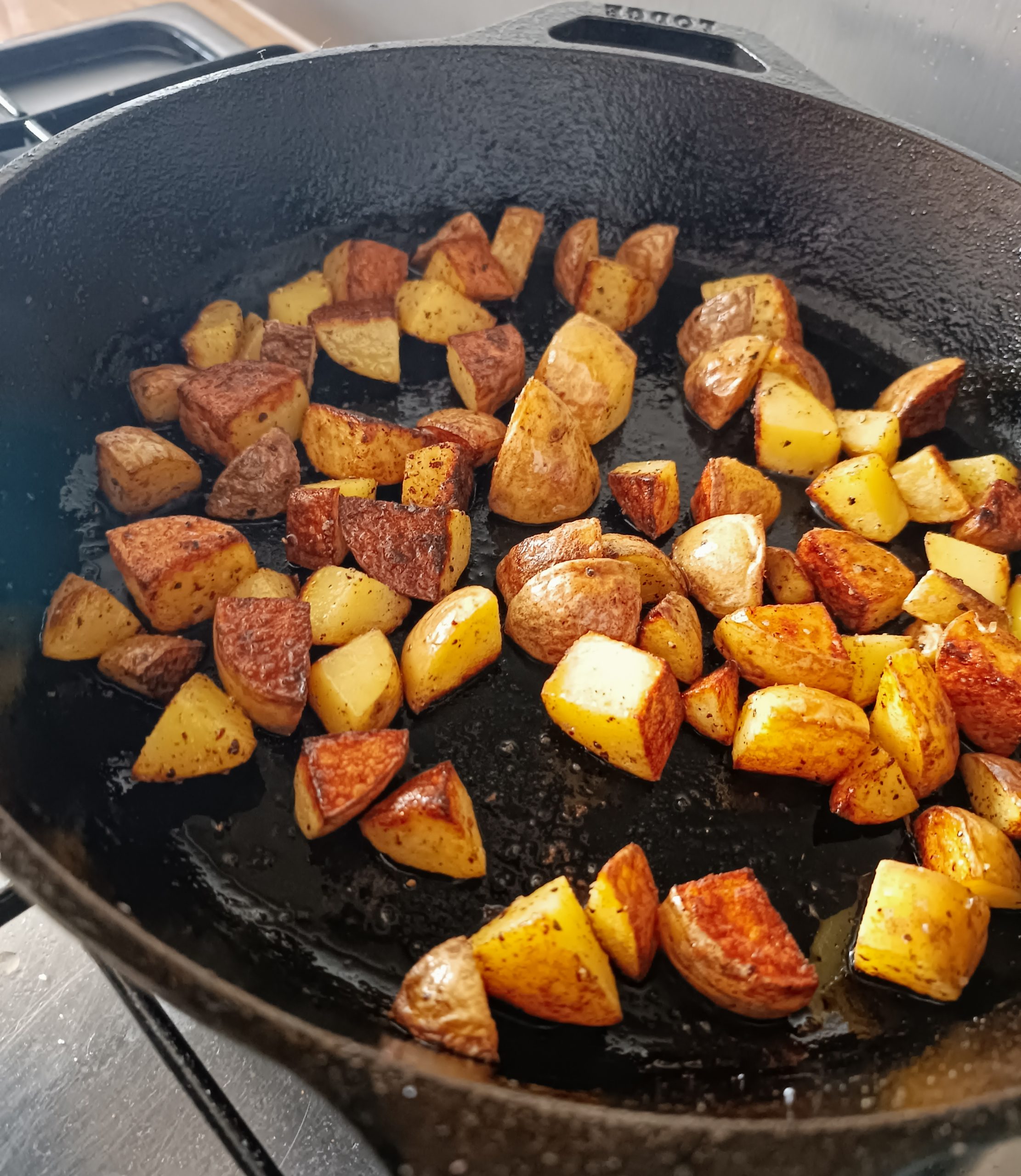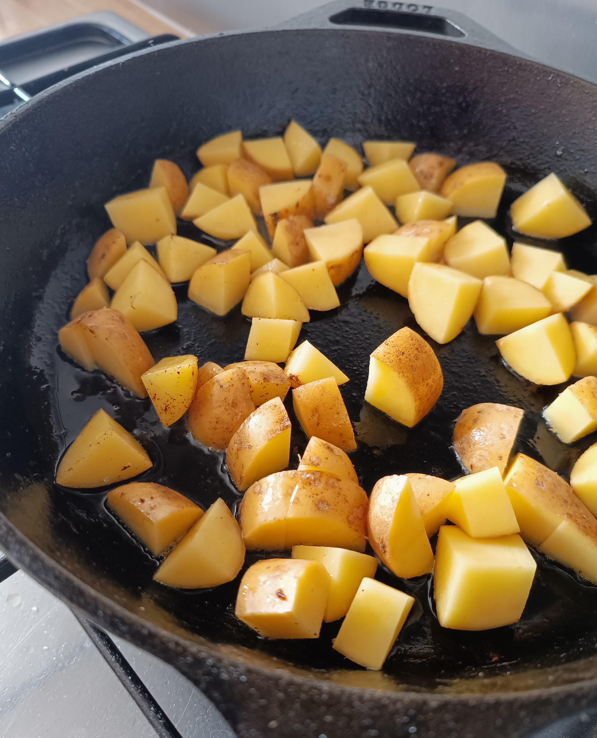 2. Ajoute l’huile d’olive et fais ensuite cuire les dés de pommes de terre dans la même poêle, sur feu moyen-fort. Sale et poivre. Étale-les un maximum et laisse-les cuire sans y toucher quelques minutes, jusqu’à ce que les dés soient bien dorés du côté en contact avec la poêle. Mélange et recommence pour dorer tous les côtés sur le même principe. Plus tu y touches, plus ça prendra de temps pour un résultat moins sexy. Compte en gros 15 minutes pour de la patate dorée et percée facilement avec une fourchette.