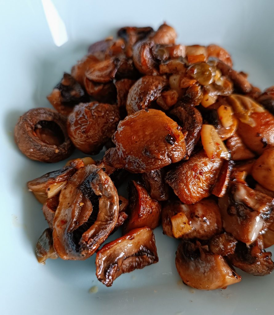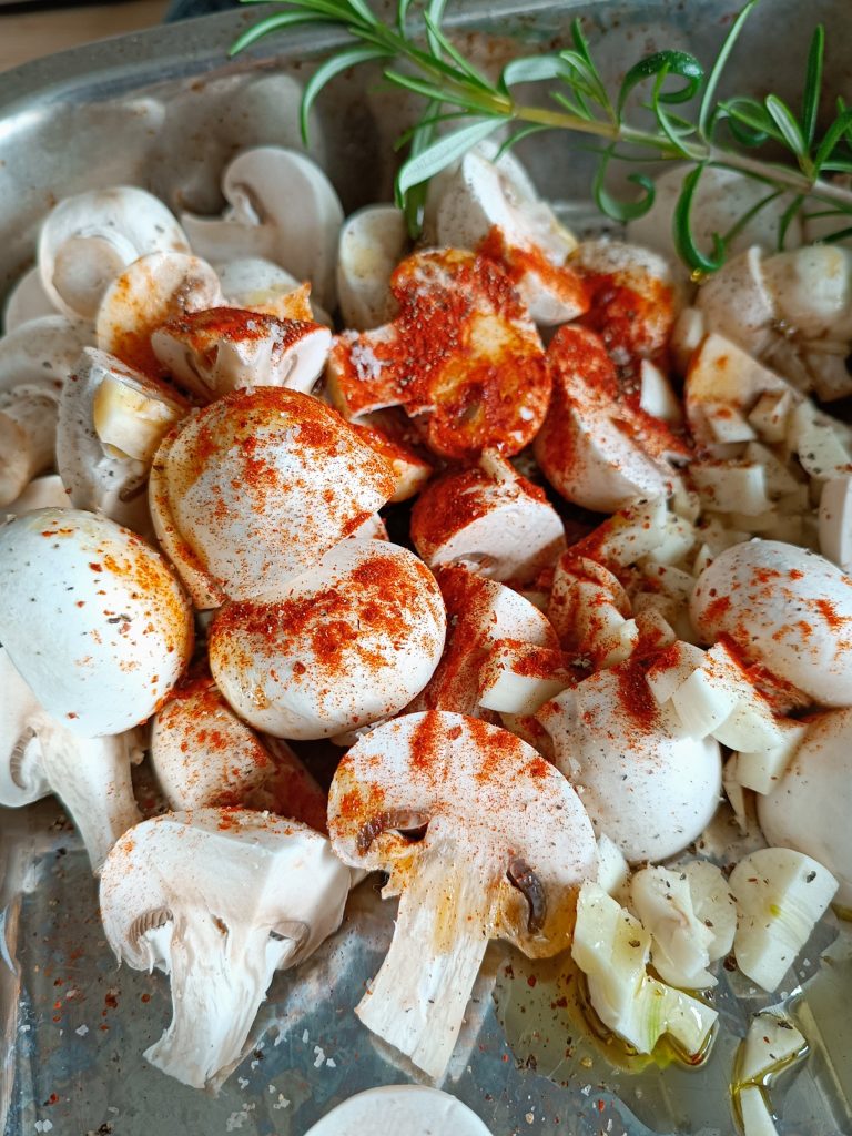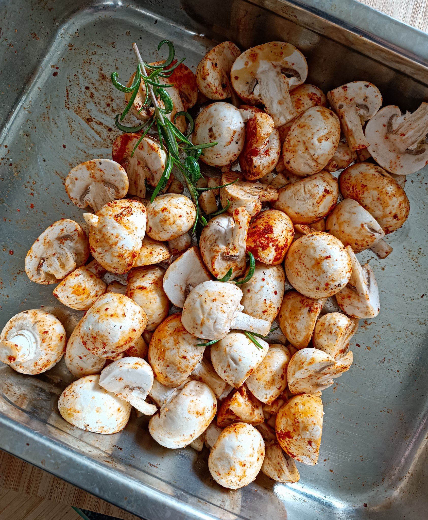 Tu peux utiliser des champignons de Paris ou n’importe quel champignon bizarre mais comestible (attention, certains demandent plus de préparation avant d’être rôtis, s’ils ont une tige qui doit être retirée).