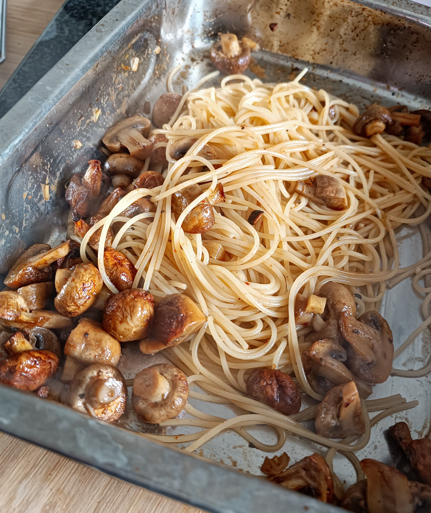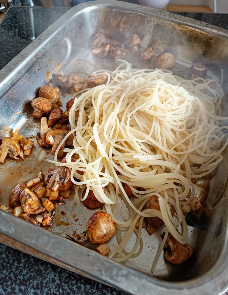 3. Garder la même quantité de garniture, 250g de champignons, mais seulement 115g de pâtes et en faire un bol rien que pour toi : un peu mon neveu.