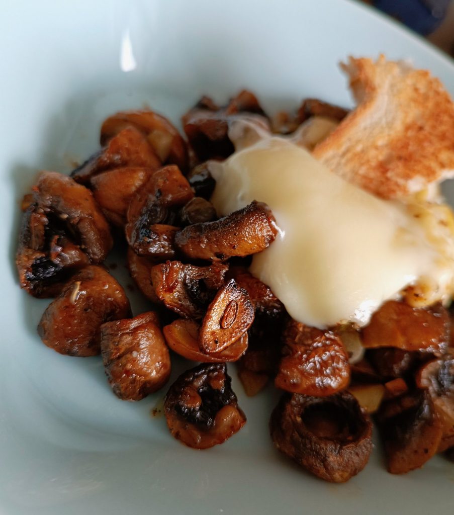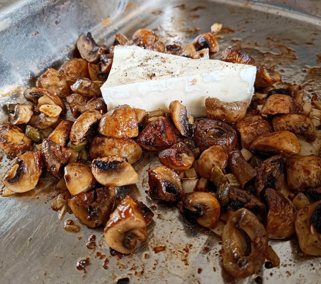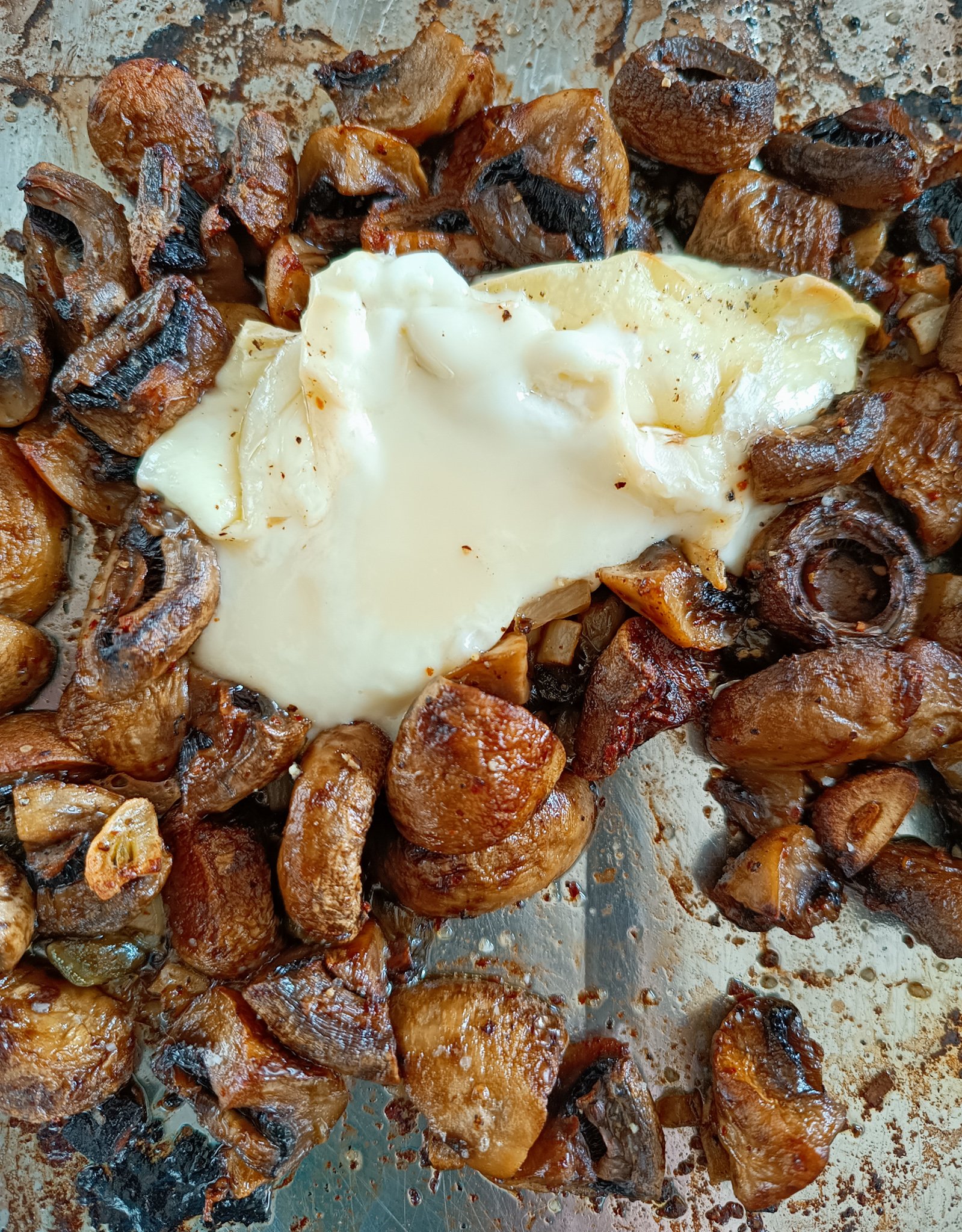 Suis la recette de base mais arrête la cuisson après 15 minutes. Ecarte les champignons et place au centre le fromage coulant de tes rêves (camembert, brie, ou n’importe quel fromage qui a du caractère). Je te laisse apprécier la taille de la bête selon tes besoins vitaux. Regroupe les champignons autour du fromage. Remets au four pour environ 10 minutes ou le temps que le fromage soit suffisamment affriolant.