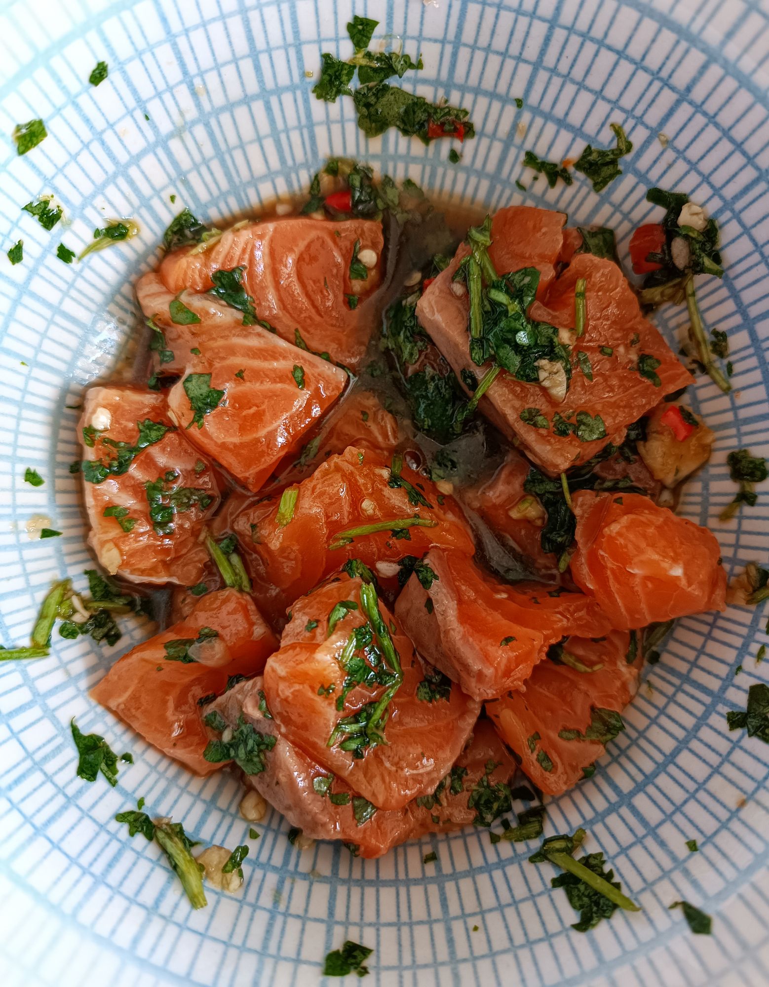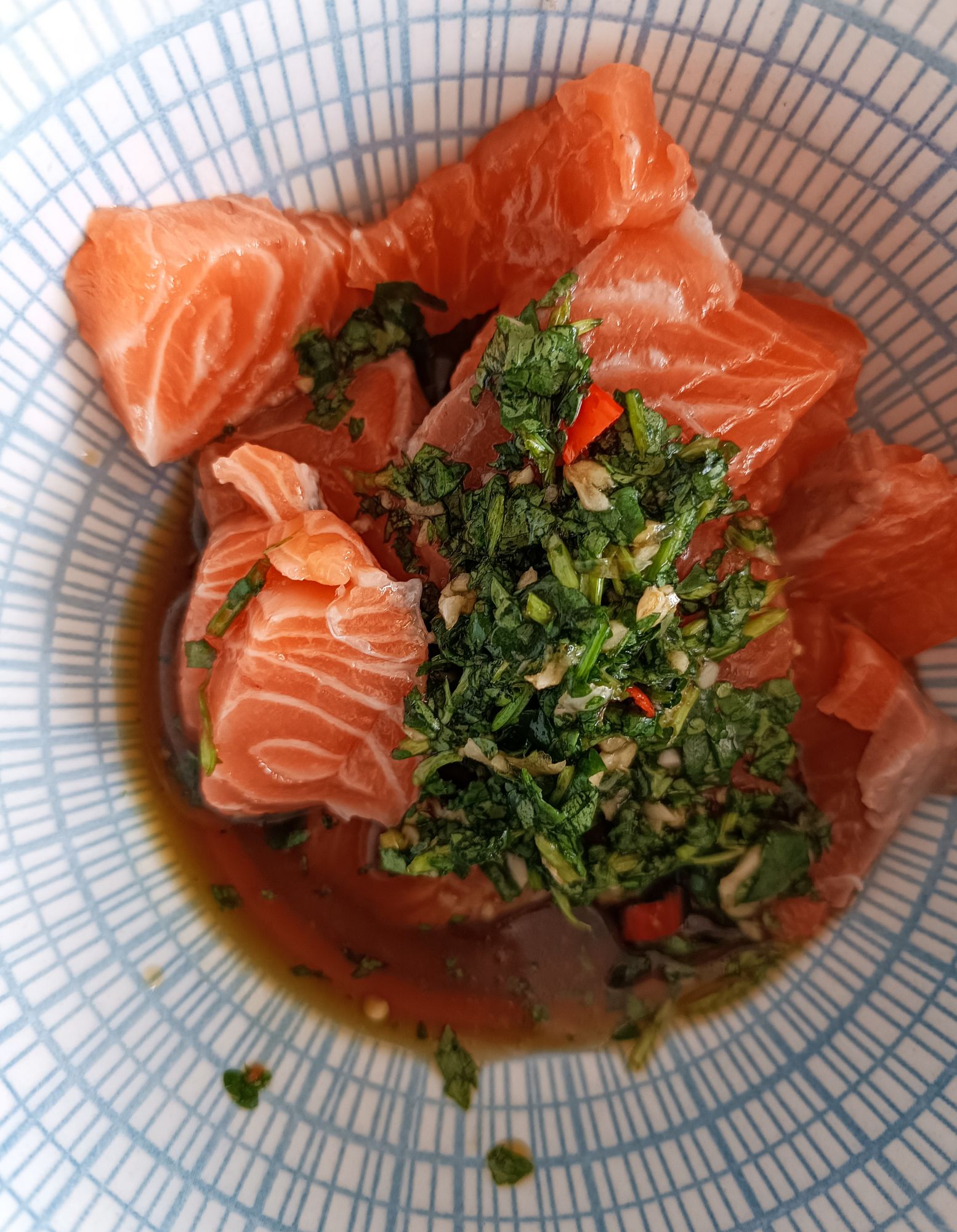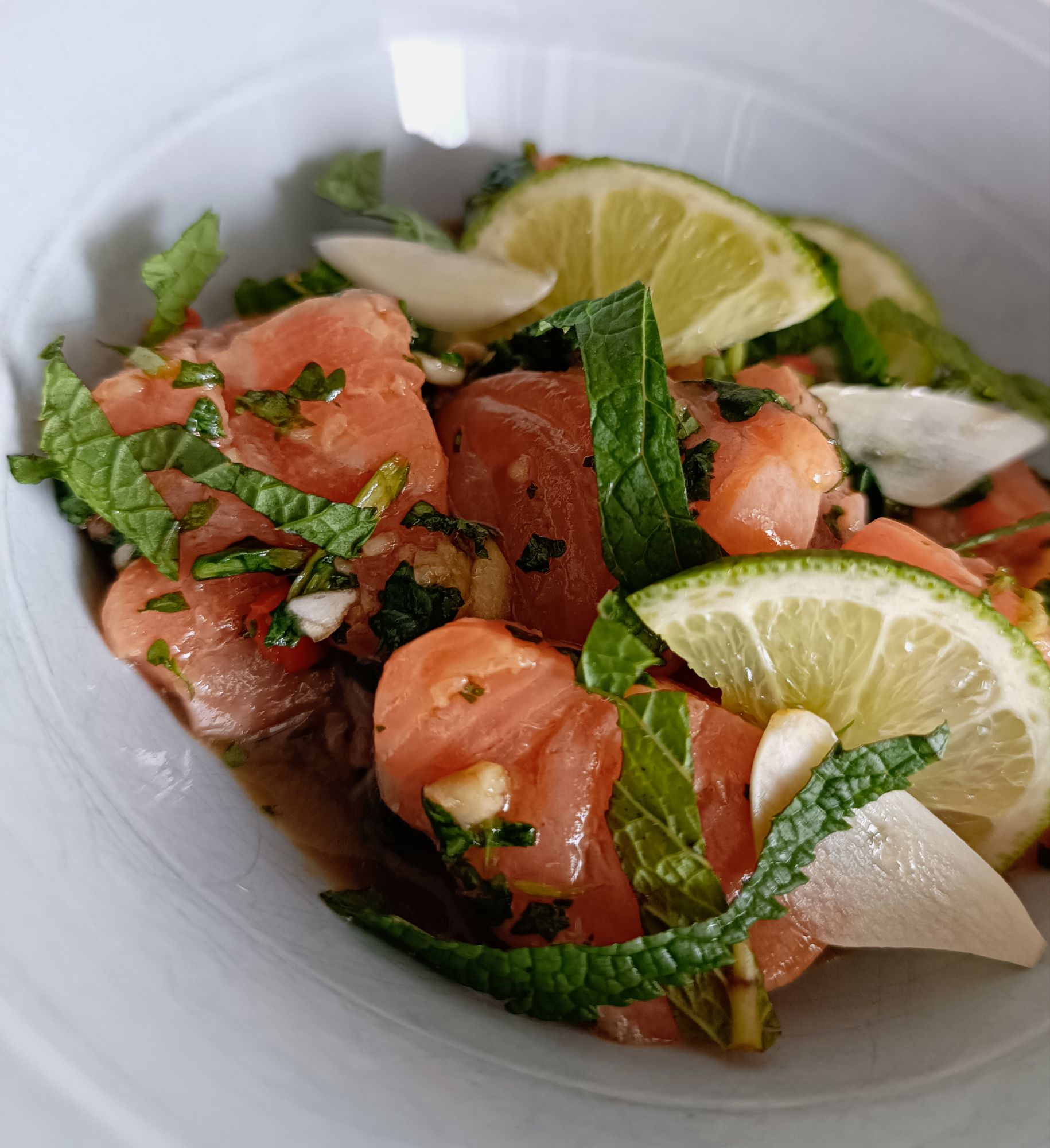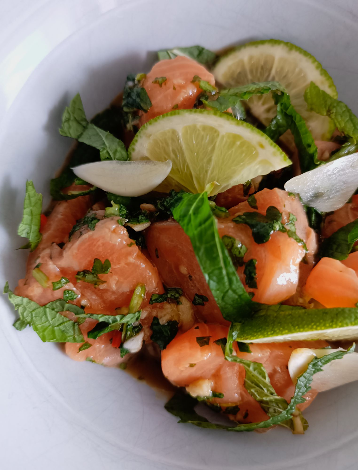 Comme un ceviche, mais express, à boulotter avant que l’acidulé du citron ne « cuise » le poisson. Il s’agit d’une salade de saumon cru, comme on en sert en Thaïlande.